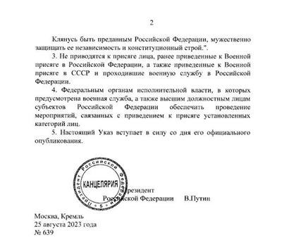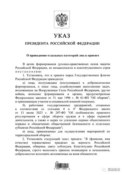 普里戈任坠机事件发生后,瓦格纳原高层集体“消失”,8月25日俄罗斯总统普京就签署了一项“即刻生效”的总统令,要求包括瓦格纳成员在内的相关人员面对国旗宣誓效忠,承诺“严格遵守指挥官和高级领导人的命令”,并公布在克里姆林宫官方网站上。