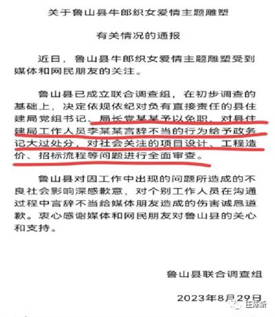 在舆论的持续发酵下,平顶山市鲁山县715万的牛郎织女雕塑这个“天价工程”终于迎来了最新进展:8月29日鲁山县政府给出明确表态:鲁山县已成立联合调查组,在初步调查的基础上,对负主要责任的县住建局长予以免职,对出言不逊、辱骂记者的的工作人员给予政务记大过处分。
