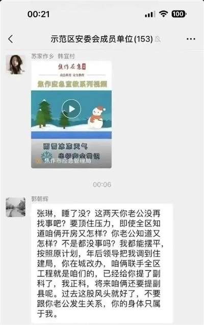 2023年2月,焦作市城乡一体化示范区城改办正、副主任突然火了,原因是这对“野鸳鸯”因私聊的“情话”在微信群被曝光而被双双免职。