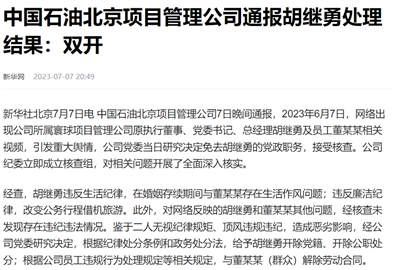事件发生一个月后,中国石油北京项目管理公司发布通报,称“经查,胡继勇违反生活纪律,在婚姻存续期间与董某某存在生活作风问题……给予胡继勇开除党籍、开除公职处分。”