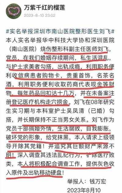 无独有偶,8月10日,深圳南山医院整形科医生刘某遭到妻子实名举报,存在“拿药品回扣”、“接受医药代表贿赂”、“非法执业”,“出轨成瘾,长期与护士、病患保持不正当关系”等多项问题: