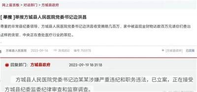 9月14日,有网友在南阳市长留言板上举报,方城县人民医院党委书记边洪昌因家中失窃被发现收受巨额贿赂;19日,方城县政府出面回复,“方城县人民医院党委书记边某某涉嫌严重违纪和职务违法,已立案,正在接受方城县纪委监委纪律审查和监察调查”。