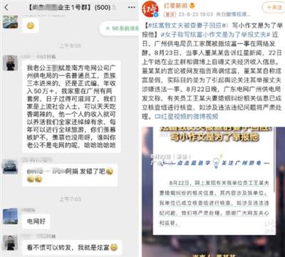 8月22日,一女子在业主群和微博上自曝在广州供电局工作的丈夫的收入信息,该女子言论被网友指责高调炫富;22日晚,该女子遭遇人身威胁要求其删帖;23日,该女子公开回应,“写小作文是为了举报他”。