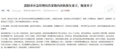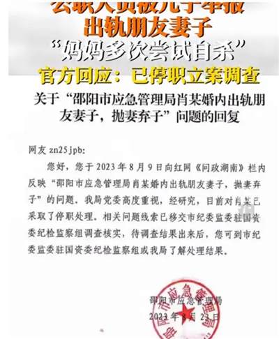 2023年8月9日,有网友向《问政湖南》栏目举报湖南省“邵阳市应急管理局肖某婚内出轨朋友妻子、抛妻弃子”,举报人自述为肖某儿子。