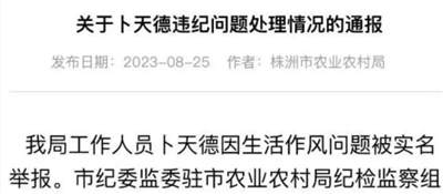 此事很快被证实。8月25日,株洲市农业农村局发布通报:给予卜天德政务撤职处分、降为四级主任科员。