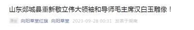 小兵刚刚看到一条喜讯,郯城红歌会在9月27日发布消息:一个月前在深夜被秘密移走的毛主席汉白玉塑像,于2023年9月26日重新敬立起来了!