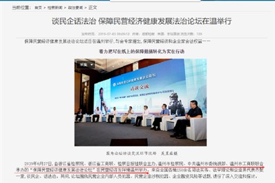 2019年6月27日,由浙江省检察院、浙江省工商联、检察日报社联合主办,温州市检察院、中共温州市委统战部、温州市工商联联合承办的“保障民营经济健康发展法治论坛”在民营经济发祥地温州举办。