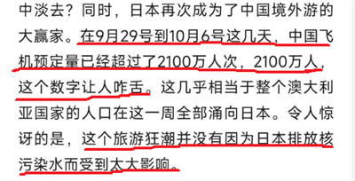 这段时间,大家在网上,应该看到不少消息,像有网帖说:日本排放核污水,根本没影响,比如说国庆这几天,就有2100万人飞日本去旅游了!