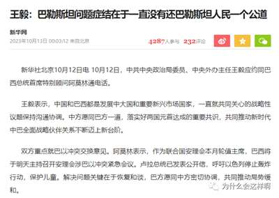 在巴以冲突发生之后,中国绝大多数的人们都支持巴勒斯坦人,就包括中国官方也给出了一个具有历史正义感的答复,王毅在昨天的发言中鲜明的指出,巴以冲突的根源在于“以色列一直没有给巴勒斯坦一个公道”