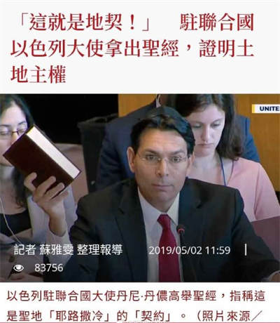 宣称砖头是巴勒斯坦恐怖袭击所用武器这一幕的无耻程度,仅次于2019年的时候以色列代表在联合国公然宣称自己的地契就是圣经,用圣经来证明自己对巴勒斯坦的土地所有权。