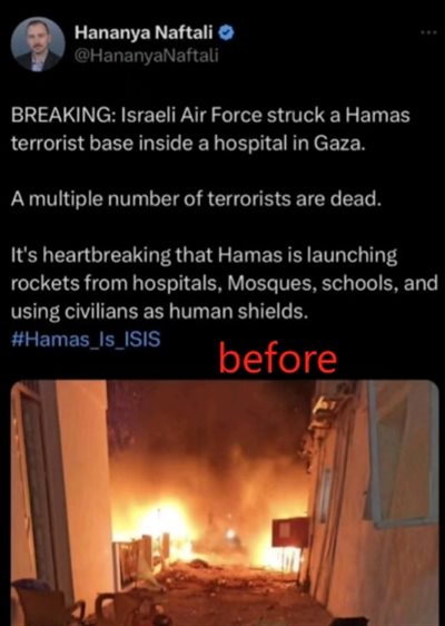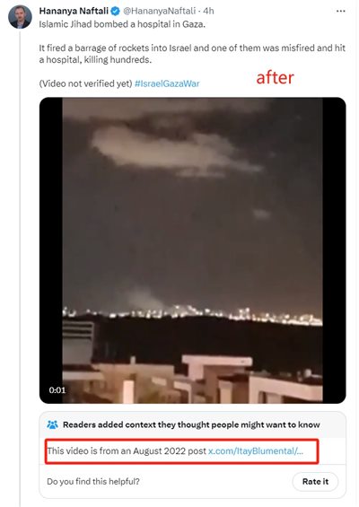 有意思的是,一些X上的以色列大V,反应极快,第一时间删掉了庆祝“我们成功地消灭了一处恐怖分子聚集地”的旧推文,改成了“哈马斯自己误炸加沙医院”的新推文,还贴心地给配了证明视频。X也很贴心,在下面做了辟谣标注——此视频来自2022年8月的一个帖子。