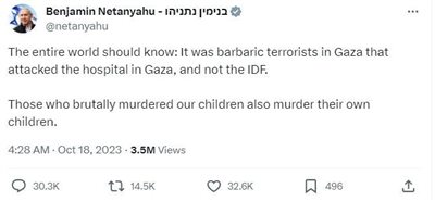 以色列方面内塔尼亚胡亲自出面,说不是我们炸的,是哈马斯自己炸的,他们导弹不行。现在以色列上下都是这个口径。