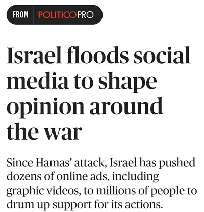在POLITICO美国版忙着给总统遮羞的同时,POLITICO的欧洲版发了一篇调查报告,称此轮巴以冲突以来,以色列向新闻和社交媒体上投放了巨量的广告和假消息,用以认知作战,塑造人们对以色列的观感,对巴勒斯坦的观感。