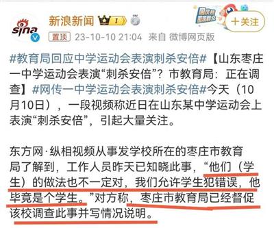 10月10日,一段近日山东某中学运动会上中学生表演的“刺杀安倍”视频,引起媒体的广泛关注。视频显示:一学生在两旁学生欢呼中站在椅子上发表讲话后,另一学生举起类似“手枪”物品对准讲话者,并上前“补枪”。后发言者做倒地状,旁人上前追堵“开枪者”。另有学生举起写有“两声枪响尸骨寒,污水排海遗后患”的横幅,围观者欢呼鼓掌。