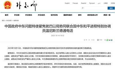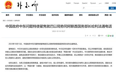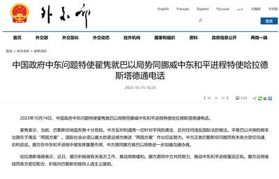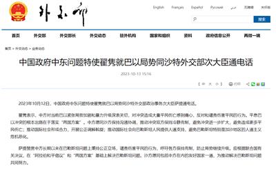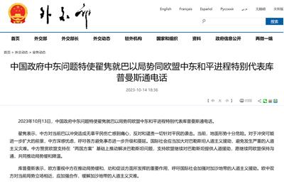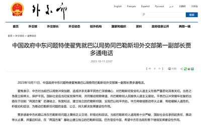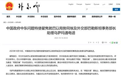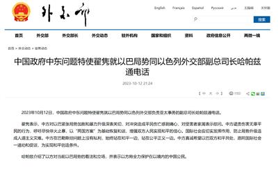 (正文)2023年10月12日,中国政府中东问题特使翟隽就以巴局势同以色列外交部负责亚太事务的副总司长哈帕兹通电话。