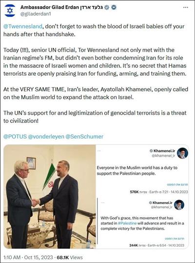 哦对了顺带提一句,以色列常驻联合国代表已经“官宣”同联合国特使“割席”,有意思的是以方代表在推文末@了拜登、冯德莱恩、舒默(美国会多数党领袖)……