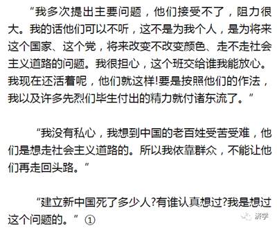 “我没有私心,我想到中国的老百姓受苦受难,他们是想走社会主义道路的。所以我依靠群众,不能让他们再走回头路。”