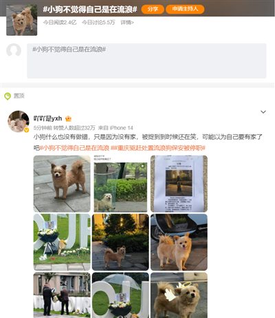 于是,针对重庆对外经贸学院保安打死流浪狗的事,“爱心人士”在昨天造出了一个热搜词条:“小狗不觉得自己是在流浪”。