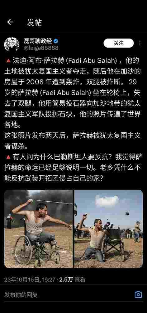3.值得注意的是这个磊哥是一个铁杆粉红,他的立场很可能是从反犹出发支持巴勒斯坦的,所以作为马列毛主义者我们也应该明白,我们不能因为支持巴勒斯坦人民而反犹,也不能因为反犹才支持巴勒斯坦人民,我们要清楚在这次战争的背后是披着宗教和民族矛盾外衣的帝国主义的侵略行径。