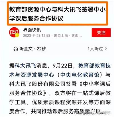 有资料显示,科大讯飞成立于1999年,是亚太地区知名的智能语音和人工智能上市企业。2000年,被认定为国家863计划成果产业化基地,与中国科学技术大学、社科院共建实验室。另外,还与教育部签订了中小学课后服务合作协议。