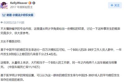 假设该团队在过去十几年里一共有过100名工作人员,在这种情况下,一年内新发三例或以上癌症的概率是十万分之5.6左右。假设全国有10000个这样的团队,由二项分布可知,全部10000个团队都不发生“一年内新诊断3个或以上癌症”这一事件的几率是97%。