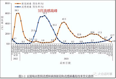 下图是中疾控的新冠疫情月报里的数据,3月流感高峰,5月新冠高峰,可以看得很明显。