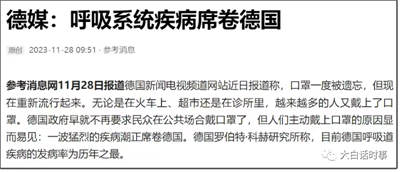 德国新闻电视频道网站近日报道称,口罩一度被遗忘,但现在重新流行起来。无论是在火车上、超市还是在诊所里,越来越多的人又戴上了口罩。原因显而易见:一波猛烈的疾病潮正席卷德国。德国罗伯特·科赫研究所称,目前德国呼吸道疾病的发病率为历年之最。