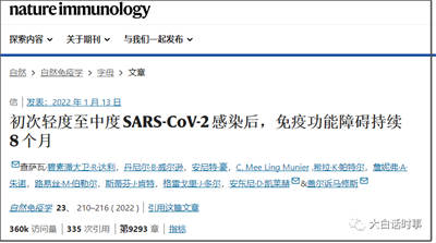 比如,发表于《nature》权威期刊2022年1月13日的这篇论文,标题就写着《初次轻度至中度新冠病毒感染后,免疫功能障碍持续 8 个月”》