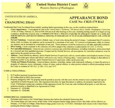 双方签署了白纸黑字的契约后,赵长鹏乖乖的交出了币安的所有客户数据,缴纳了约45亿美元的资金,在美国联邦法院官网公布了赵长鹏的保释文件后,坐飞机来到了美国本土。