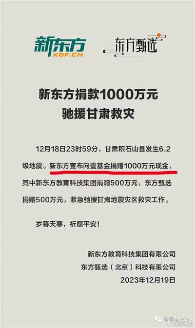 昨天晚上,看到@俞敏洪 先生在微博发消息称,新东方捐款1000万元驰援甘肃救灾(图1),我忍不住想要点赞,结果定睛一看,发现新东方的1000万元并不是直接捐给甘肃灾区,而是捐给了壹基金。