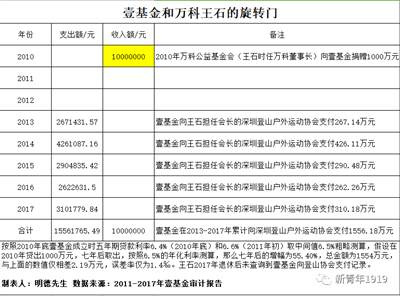 7.复一下盘,2010年,王石先生担任万科董事长,万科旗下的万科公益基金会向壹基金捐赠了1000万元,三年后,2013-2017连续5年,壹基金向王石先生担任会长的深圳登山户外运动协会支付了1556万元。