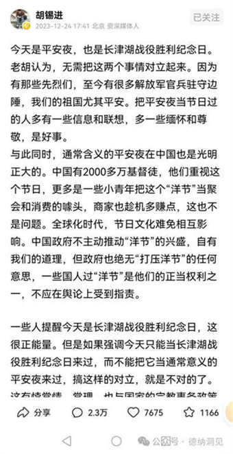 而这次圣诞节过节风波,因与抗美援朝的长津湖战役同一天,胡锡进也是一个积极参与讨论者。