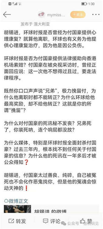 付国豪之死实际上是美国势力在背后所指使的恨国党,事后对其个人长期围剿,引起其长期心理压力所造成的!国家对其保护不够。本来应该由国安出面来保护中国英雄的,他是反香港暴乱的精神象征,是国家反暴乱英雄,本应当对其予以足够的保护。但由其孤单个人,长期独自面对及承受国内外恨国党的长期网暴,造成心理伤害,从而造成悲剧。这个也是邪恶势力要达成的目的,就是让你不敢爱国,爱国有代价。