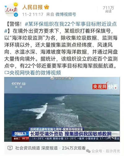 2022年,《人民日报》就曝光过境外间谍以海洋环保为名搜集我军事情报和敏感数据的案件。