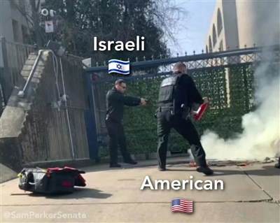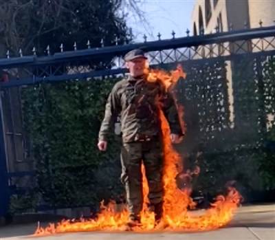 如果只有这些,或许激不起什么水花,毕竟舆论界放嘴炮的人多了去了。随后风云突变,亚伦·布什内尔来到以色列驻美国大使馆前,将左手瓶子里的液体浇在身上,点燃打火机,高喊“自由巴勒斯坦”。