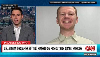 他对着镜头说:“我的名字是亚伦·布什内尔,我是美国空军的现役军人,我将不再参与种族灭绝。我即将采取极端的抗议行动,但这与巴勒斯坦人正在经历的事情相比,根本不算极端。”