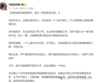 听说有一个叫铁流的作家,(又是作家,真是勾栏一族啊),说要反诉那位想起诉莫言的网友,作为我来说,咱不像那些双标狗一样,我支持这个叫铁流的作家起诉,你觉得有理就说是吧,看看到底这个社会公理在哪里!我还没有看到哪个支持起诉莫言的人对于这个铁流说什么”运动了“”文格了“”破坏改革开放大环境了“,这至少说明了一点,支持起诉莫言的网友比起那些害怕起诉莫言的”精英“们格局高出很多了。