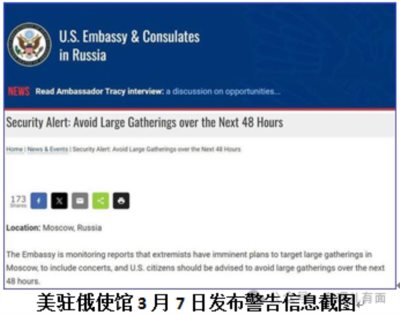 原来,在3月7日,美国驻俄罗斯大使馆曾毫无征兆的在其官网发布警告称:据可靠情报,极端分子未来几天将对莫斯科大型集会(包括音乐会)发动袭击。建议在俄美国公民避免参加大型集会,特别是“音乐会”。