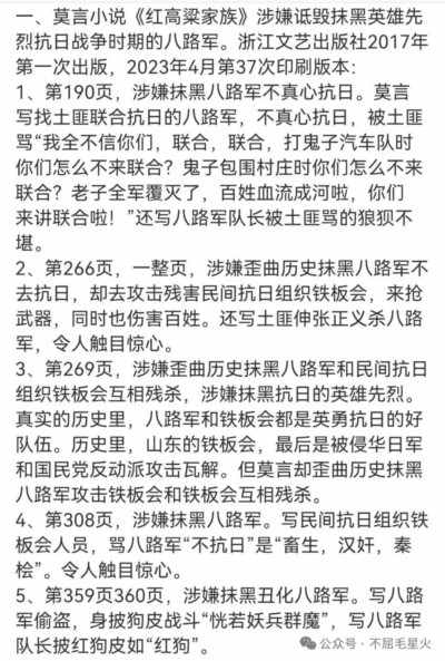 1、莫言书籍《红高粱家族》为何歪曲历史写我们的八路军英雄先烈残害民间抗日组织铁板会?历史上,铁板会是被侵华日军和国民党反动派残害,为何莫言要将侵华日军和国民党反动派做的事,扣在八路军头上?文学小说难道就可以无底线是非不分抹黑英雄先烈?莫言居心何在?