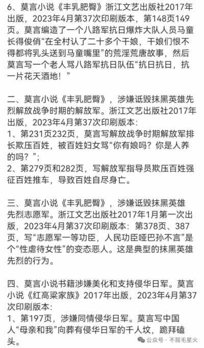 2、莫言书籍《丰乳肥臀》为何写解放军欺压百姓,为何写解放军强征百姓推车,导致百姓自尽身亡?这是不是抹黑英雄先烈?如果是事实,请莫言拿出证据来,如果拿不出,就是在抹黑英雄先烈。