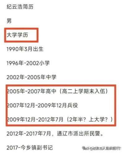 从纪云浩的简历来看,他2007年入伍时,只是高二上学期末,最多是高中学历,从他2009年复员,到2012年7月参加工作,只有两年半的时间,他的大学学历是如何取得?