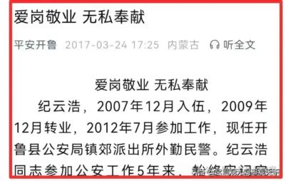 第二个质疑,战士复员的纪云浩并没有部队干部身份,他又是如何进入通辽某派出所当民警的?是正式的,还是临时的?
