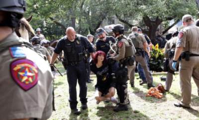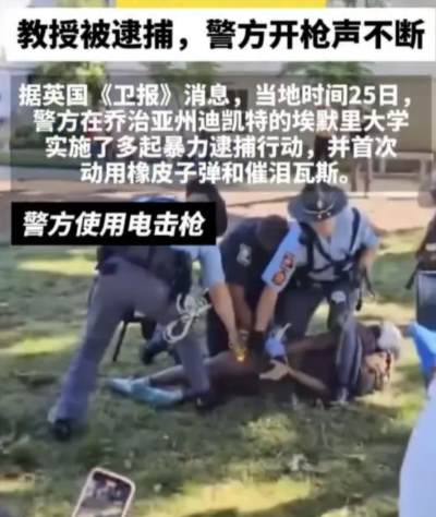 在美国,学生和教授们遭到了粗暴对待,埃默里大学经济学教授卡罗琳看到校园里一名抗议者被暴力逮捕,遭警察摁倒在地,卡罗琳头部撞在水泥地上,眼镜被甩了下来,她大喊 “我是教授,我是来看学生的,你们要干什么?”,但仍遭到警方逮捕。另一位来自哲学系的主任诺埃尔·麦卡菲也同样被警察戴上手铐押走。