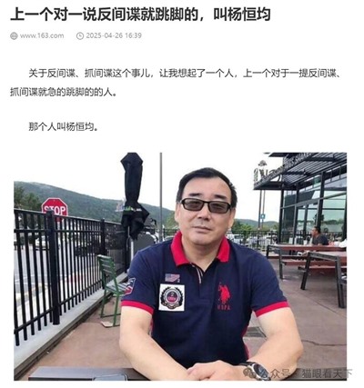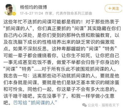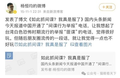 还记得曾在网上呼风唤雨的那个公知大V杨恒均(杨军)吗?同样也是百般质疑反间谍的言论,提到抓间谍的事他就流露出极度的反感与厌恶,结果,事实告诉人们,石砸狗叫,说的就是这种货色。