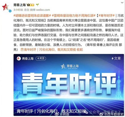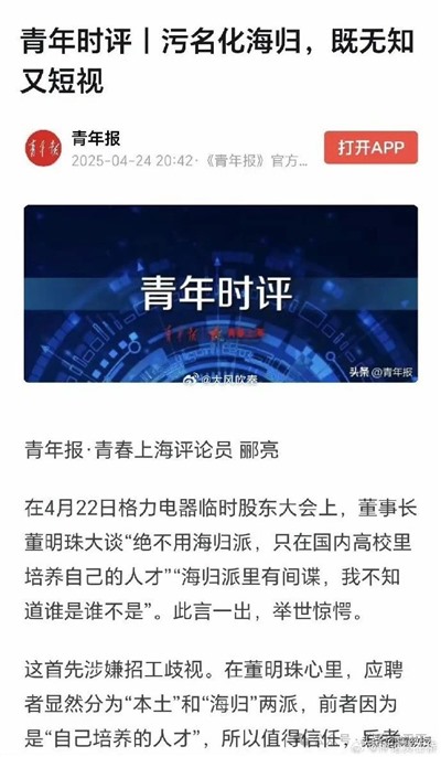 4月24日,《青年报》怒斥董明珠:“污名化海归,既无知又短视”,文中指出,董明珠之谬误,应做清醒的匡正。