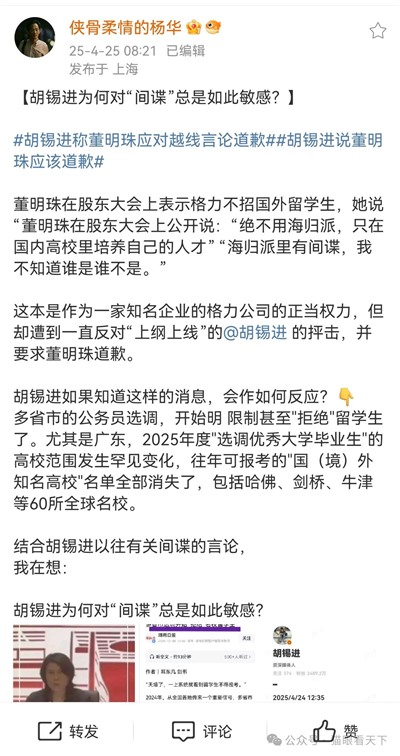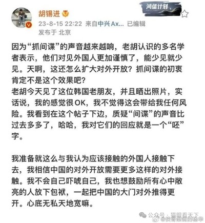 @侠骨柔情的杨华:我在想:胡锡进为何对“间谍”总是如此敏感?