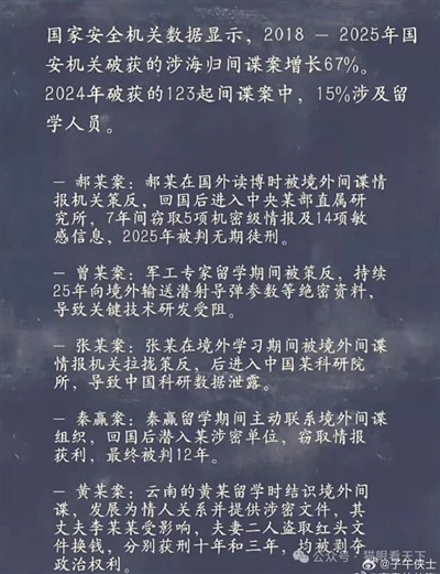国家安全机关数据显示,2018-2025年国安机关破获的涉海归间谍案增长67%。2024年破获的123起间谍案中,15%涉及留学人员。