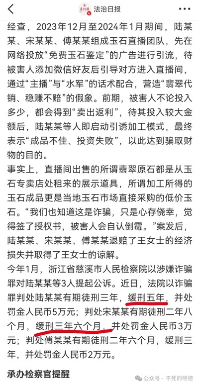 而且,就在不久前的4月底,@中央网信办举报中心 转发法治日报的一条微博显示,有人通过网络平台做直播吸引粉丝,然后搞玉石诈骗,有几个人被判刑了,被判刑的地方就在浙江,最令人想不通的是,仅一名消费者就被诈骗了将近50万,整个诈骗金额到底多少?可想而知。