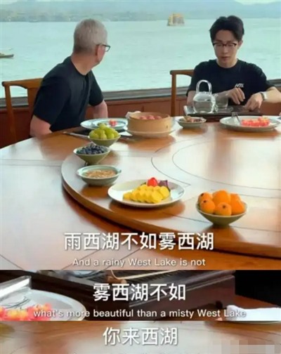 第二个事情是前段时间库克去杭州,何同学在西湖边接待库克,对他说“雨西湖不如雾西湖,雾西湖不如你来西湖”。