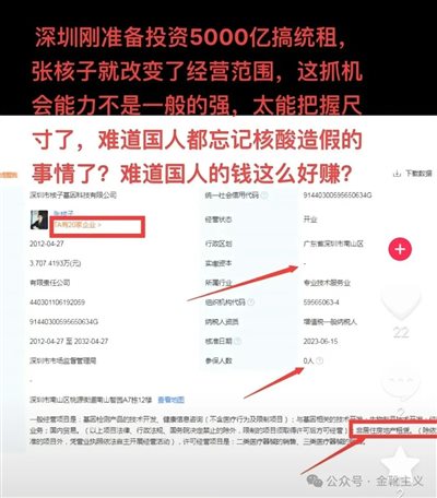 预制菜、统租楼、保健品......对比一众同样大发国难财、但是“收手过晚”导致后续成本积压、至2023年以来一度不得不向政府讨债的其他核酸公司,看看稳坐钓鱼台的张核子的核子华曦,什么才叫一叶知秋、未雨绸缪啊(战术后仰)。